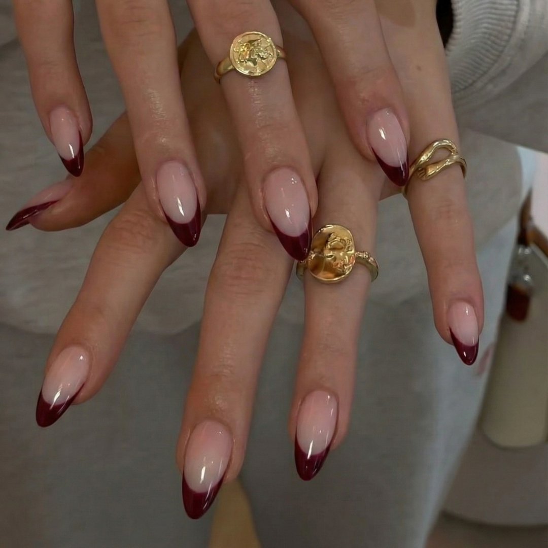 Šis dizainas – drąsi prancūziško manikiūro interpretacija. Natūralus pagrindas susilieja su sodria vyno spalvos linija, kuri suteikia nagams charakterio ir prabangos. Tobulas pasirinkimas toms, kurios mėgsta klasiką, bet nori ją pamatyti stipresnę ir modernesnę.