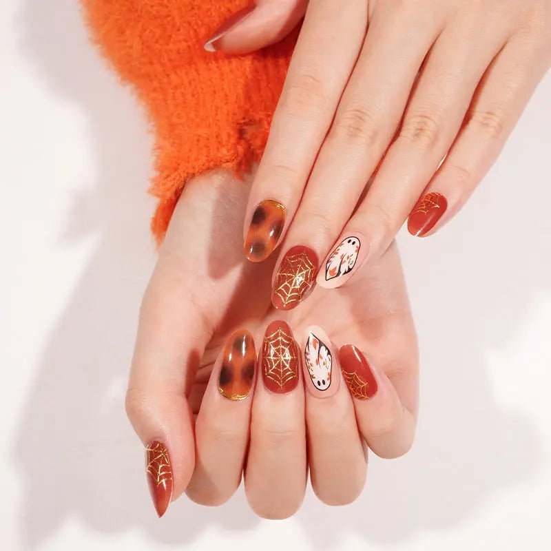 DrÄ…sus, žaismingas ir tobulai tinkantis Helovyno sezonui! Å is dizainas su auksinÄ—mis voratinklių detalÄ—mis ir Å¡iltomis rudens spalvomis sukuria iÅ¡skirtinį, bet stilingÄ… įvaizdį. Tobulas pasirinkimas toms, kurios nori, kad jų nagai taptų Å¡ventÄ—s akcentu – be jokio vargo.